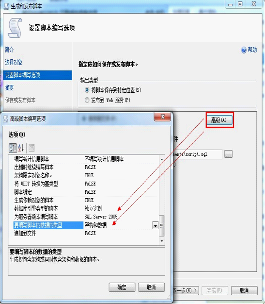 3.在设置脚本编写选项这一步中点击“高级”,设置“要编写的脚本的数据类型”和“为服务器编写脚本”为“SQL SERVER 2005”和“构架与数据”。