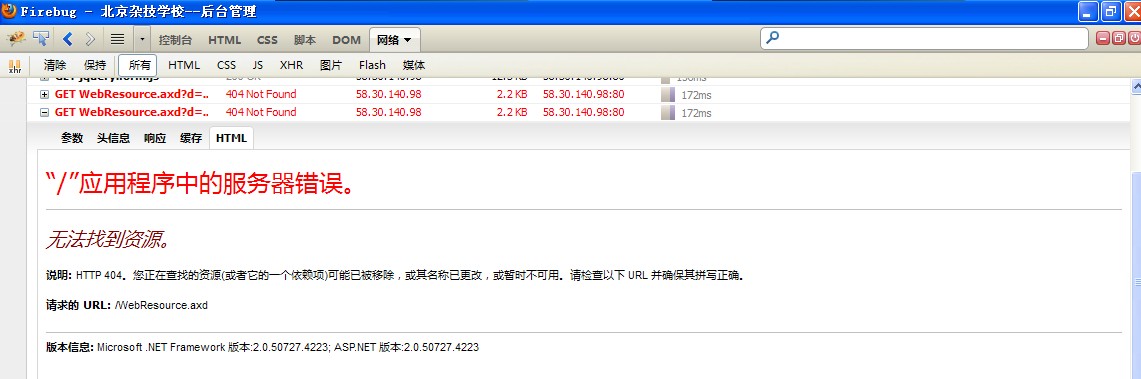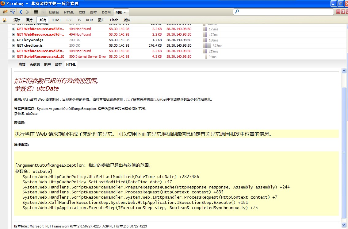 原因分析:由于浏览器中页面没有跳转,也没错误提示,所以排查不了问题,更换了火狐浏览器后重新操作一遍,在FIREBUG插件下,出现了两个错误提示,其中一个是提示“参数值已经超出有效范围”,并且错误代码中有提到DateTime这个参数,另外一个提示“WebResource.axd文件没找到”。