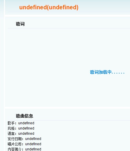 问题:4.6版本中,音乐模型栏目在添加了音乐之后,在前台选择播放时,在IE8中正常,但是在IE9和火狐中标题和简介出现undefined的情况。