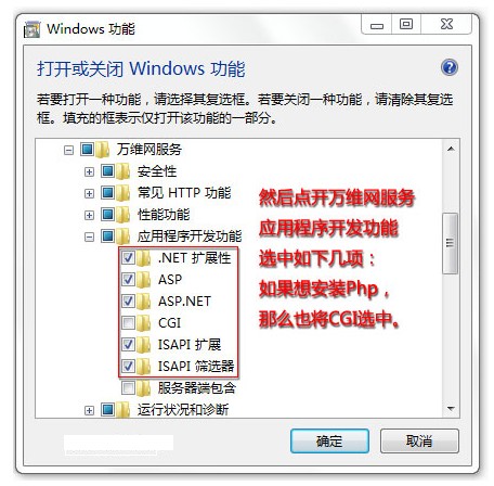 然后点开万维网服务,点开应用程序开发功能,依次选中:.NET扩展性、ASP、ASP.NET、ISAPI扩展、ISAPI筛选器,如果想安装PHP,需要将CGI也选中。