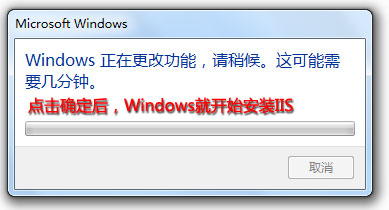 选中这些之后,其他默认即可,然后点确定。Windows就开始安装IIS了。