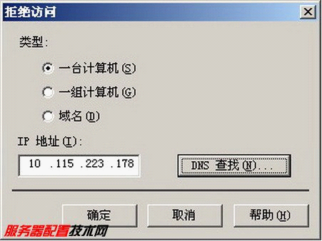 1.选中“一台计算机”单选框可以拒绝某一台特定计算机访问该站点,只需在“IP地址”中输入想要拒绝的IP地址即可;