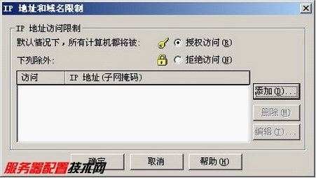 第2步,单击“IP地址和域名限制”区域中的“编辑”按钮,打开“IP地址和域名限制”对话框。默认情况下“授权访问”单选框处于选定状态,单击“添加”按钮,如下图所示: