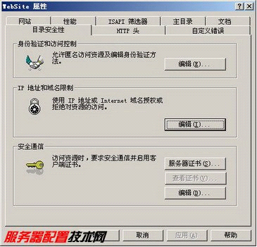 第1步,依次单击“开始”→“所有程序”→“管理工具”→“Internet信息服务(IIS)管理器”,打开“Internet信息服务(IIS)管理器”窗口。然后在左窗格中依次展开ServerName→网站,并右键单击Web站点的名称,执行“属性”快捷命令。打开站点属性对话框,然后单击“目录安全性”标签,切换至“目录安全性”选项卡。如下图所示: