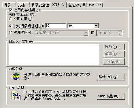 对于静态文件启用内容过期可以提高访问性能。首先网站的目录要划分合理,图片、CSS、JavaScript均放在单独目录下,然后在IIS中选择目录,点属性-HTTP头,启用内容过期,可以选择30天后过去,这样,用户浏览器将比较当前日期和截止日期,以便决定是显示缓存页还是从服务器请求更新的页,由于图片、CSS、JS通常变化较少,因此基本上都从本地缓存读取,从而加快显示速度。