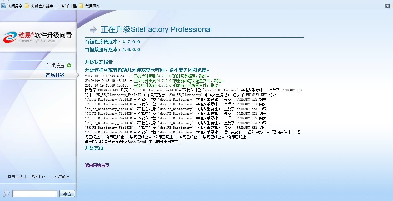 分析原因:网站升级程序中的数据库脚本中插入数据时,由于受主键唯一约束的影响造成语句终止,无法升级完成。