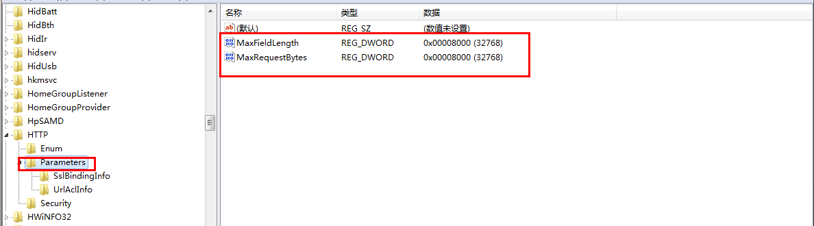 2、 找到 HKEY_LOCAL_MACHINESystemCurrentControlSetServicesHTTPParameters,在其下面添加两个参数MaxFieldLength与MaxRequestBytes ,类型都是DWORD,十六进制数值数据为8000。如下图: