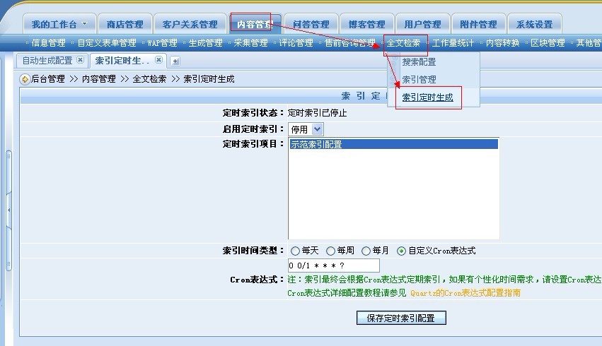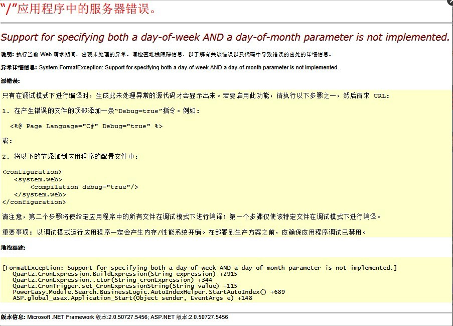 问题分析:从错误信息来看,初步判断是和时间有关,网站时间是和服务器同步的,然而检查了服务器的时间并没发现有问题,接着再仔细分析了一下错误代码,发现有提到“Quartz . CronExpression”,在后台功能中只有两个地方需要用到“Cron表达式 ”,一个地方是静态自动生成时间设置,一个地方是全文检索索引文件自动更新时间设置。