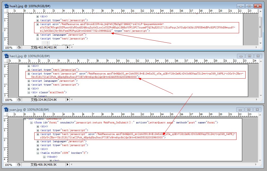 这里截取正常默认网站的这个信件查询页面的信件查询提交的这段js 截图;然后找到客户定制的功能的查询信件按钮的js (截取客户页面里面的js),和把客户的网站的js修改后的js都放到PS里面进行对比,通过代码分析