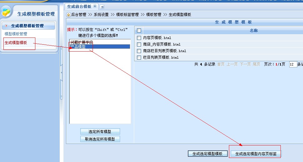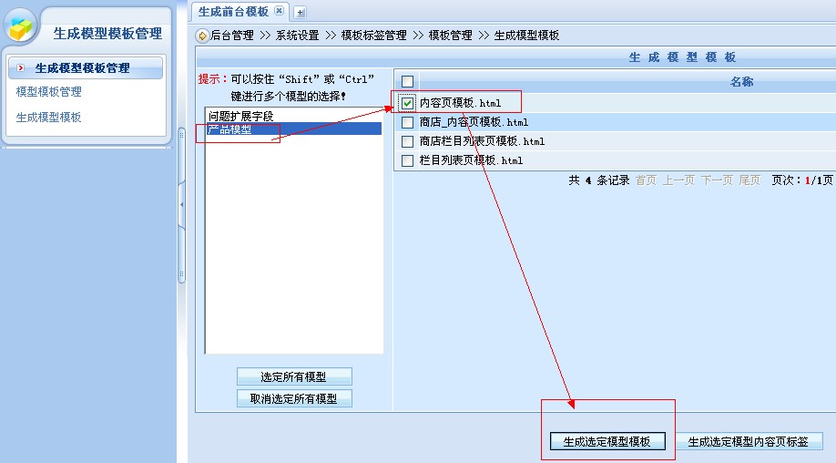 2、添加好模型后,到系统设置 >> 模板标签管理 >> 生成模型模板管理 ,根据下图依次点击: