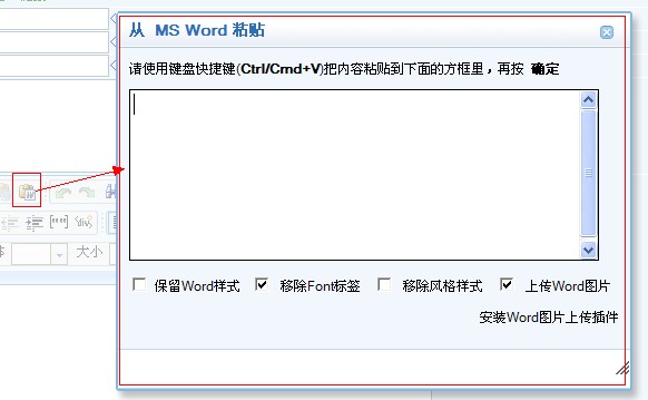 在添加文章的时候,经常会从word文档中复制再粘贴过来,为了保持word中的格式和图片,我们系统在添加文章的编辑框中提供了“从 MS Word粘贴”这个功能,点开后如下图: