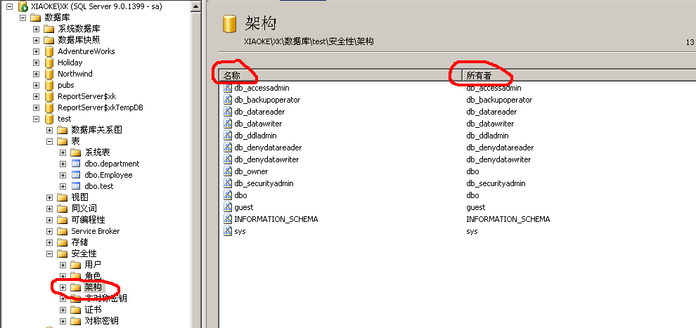 1。SQL SERVER MANAGEMENT STUDIO》数据库》安全性》构架,先删除对应的构架