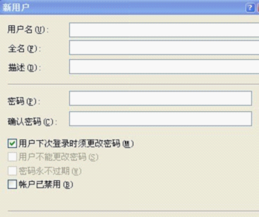 2、右边单击右键,弹出新用户对话框。这里要填写账号密码--此账号密码要记牢,后边要用到多选按钮默认是第一个(用户登录时更改),应改为勾选第2个和第3个,用户不能更改密码和密码永不过期。最后单击确定,此时在右边能看到自己添加的用户、