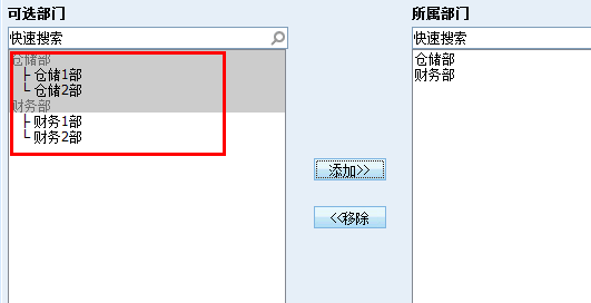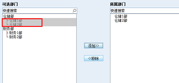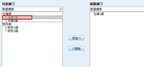 仓储1部和仓储2部是仓储部的子部门,把仓管员A添加到仓储部下面,则享有了管理仓储部及仓储1、2部所有管理员负责的订单的权限。