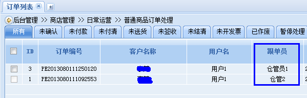 例如下图,仓管1和仓管2同属于仓储A部,给仓管1所属部门的权限,则可以看到自己和仓管2负责的所有订单。
