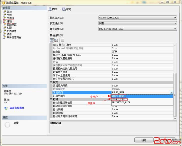 一、首先要把数据库变成单用户模式,否则会报“排它锁报错”