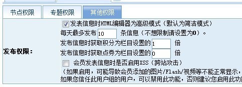 会员组管理--权限设置--菜单控制--添加内容信息 <=【设置详细的发布权限】,这里面有个“其他权限”中设置“每天最多发布信息”