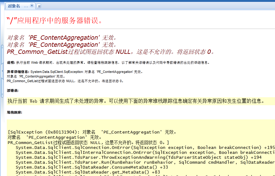 打开内容聚合报错:对象名"PE_ContentAggregation"无效