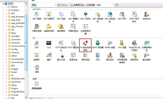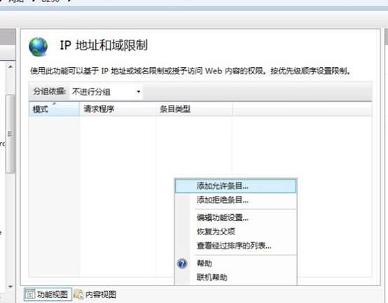 在IIS上,点击网站,在功能视图中,可以看到“IP地址和域限制”,点击进入设置界面。