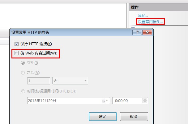 通过IIS管理界面,选择好将要设置的站点,然后在右侧功能面板中,选择“HTTP响应标头”,然后在功能页面中,点击右侧的“设置常用标头”。在弹出的对话框中勾选“使web内容过期”并设置过期时间。