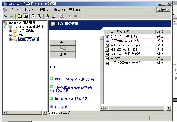 默认情况下, IIS 出于安全考虑会禁用动态内容。当确实要使用它启用动态内容。 管理员要允许 IIS 来提供内容要求特定 ISAPI 或 CGI 扩展 Web 服务扩展列表,同时启用ActiveServerPages