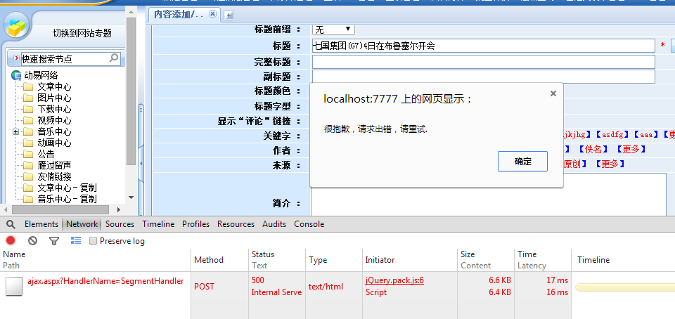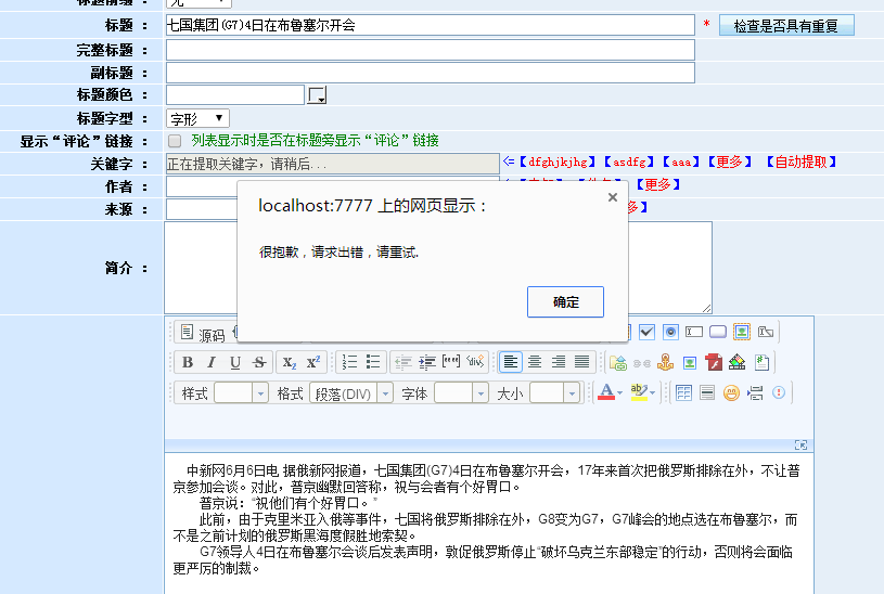 问题描述:添加文章时,关键字字段处点击自动提取后,弹窗提示:“很抱歉,请求出错,请重试。”,如下图所示: