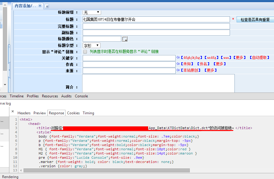 点击该出错信息,进一步分析该500错误的详细信息(Response信息),得知由于App_Data文件夹权限不足而引发的错误。如下图所示: