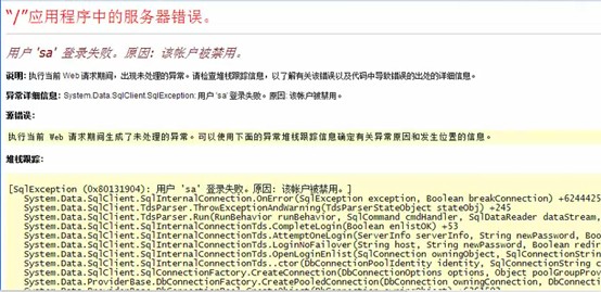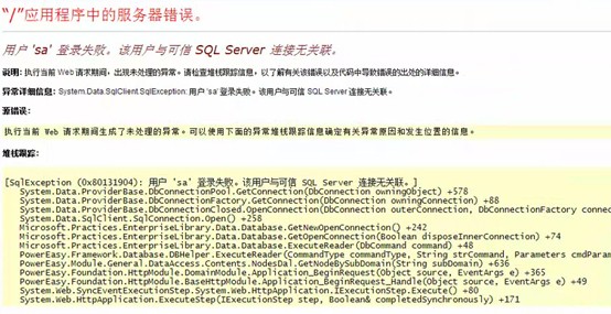 问题描述:需要帮助客户部署网站,客户服务器环境准备好以后,按部就班一路下来,最后浏览前台的时候发现报错,把数据库登录名换成sa也是一样