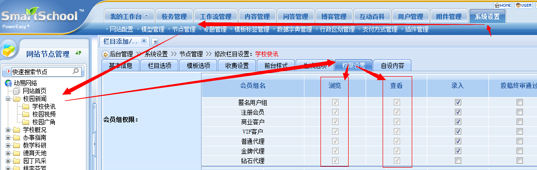 问题分析:默认会员组的“浏览”、“查看”已经勾选,并为不可以去掉勾的灰色。如何去掉不可更改的灰色限制?