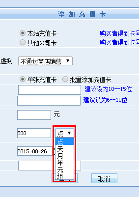 问题分析:检查看到添加充值卡的时候,充值卡点数、资金或有效期一栏选择的单位为“点”,也就是充值卡为一张点卡充值卡,并不是现金充值卡