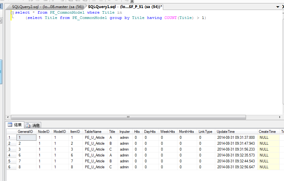打开SSMS,在系统使用的数据库里执行如下语句,即可把标题重覆的文章从PE_CommonModel表里找出来。