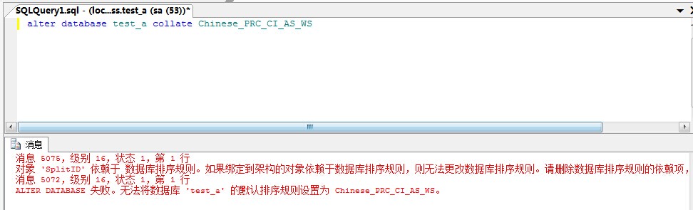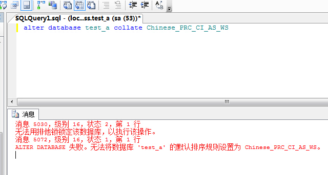 ALTER DATABASE 失败。无法将数据库 'test_a' 的默认排序规则设置为 Chinese_PRC_CI_AS_WS。