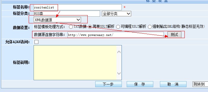 因为有了其他网站RSS文件,这个标签这里选择XML数据源,填写。数据源连接字符串。(比如填上“网址/RSS/RSS.ASPX”)