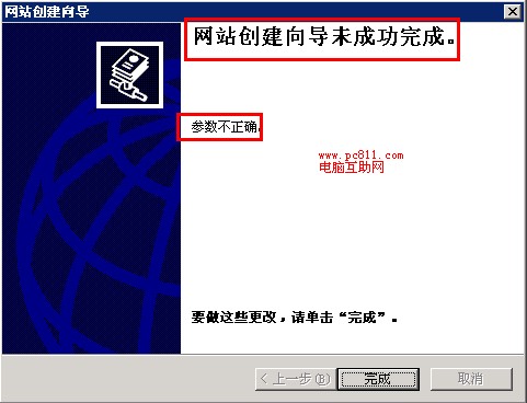 (IIS网站创建向导未成功完成参数不正确)单击完成之后,没发现没啥问题,但是在网站上右键启动时,却还是提示错误参数不正确