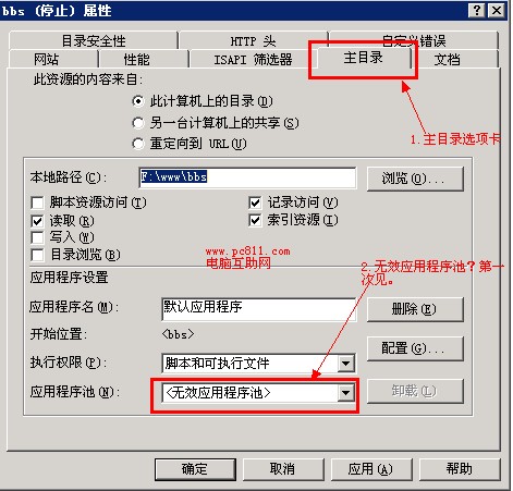 解决办法: 在IIS网站上右键,打开网站属性程序窗口,切换到“主目录”选项卡,这时发现应用程序池显示<无效应用程序池>。把这个应用程序池,改成自己建的bbs应用程序池发现IIS网站可以启用了。
