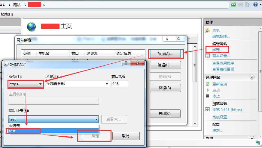 二、服务器证书创建完成后,即可配置我们的站点使用HTTPS协议,配置过程如下图所示: