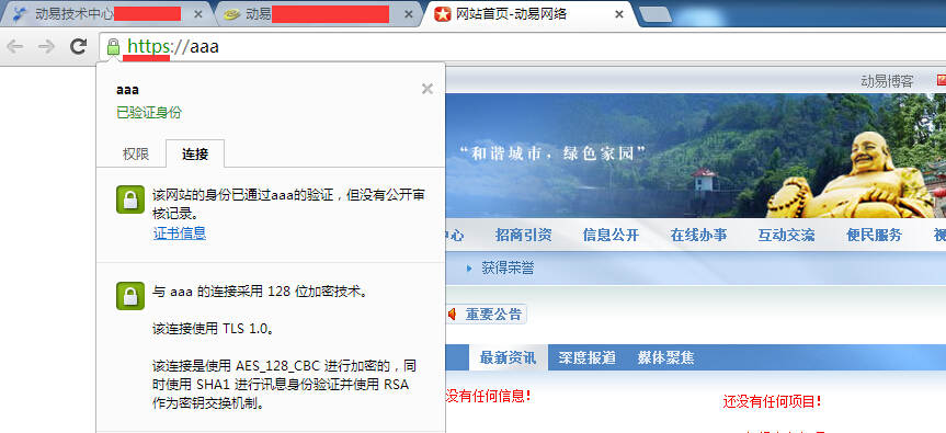 三、配置完后,用https://+服务器名,即可以安全链接和通讯加密的方式来访问网站。