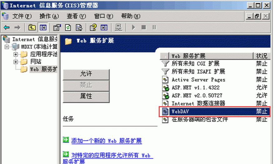 问题分析及解决:WebDav服务扩展通常用来让DW等客户端软件分布式创作并发布至网站,动易的系统通常情况下用不差这服务扩展,可将期禁用,在IIS下,点开“Web服务扩展”,在右侧把WebDav禁用即可,如下图所示: