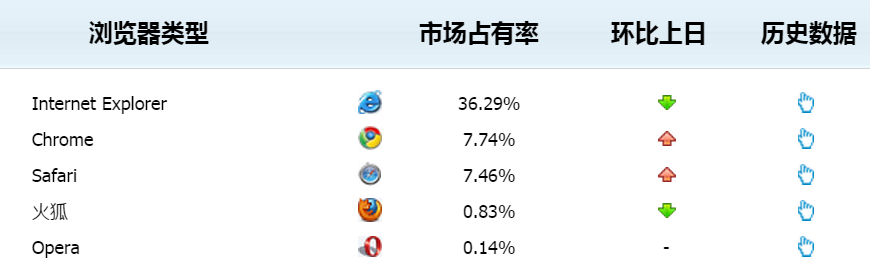 上图表中可见,HTML5标准推荐的视频格式中,目前未有任何一种格式能在所有浏览器都被支持,因此,我们需要选择一种支持得最广泛的视频格式。下图为CNZZ统计的主流浏览器市场占有率数据。