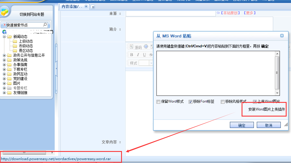 如何修改编辑器中“安装word图片上传插件”下载地址 来源:本站原创 点击数: 次 发布时间:2015年09月30日 问题描述:有的不能连接外网只能连接内网,那么在上传图片时候需要用到这个插件,如何改变这个插件的下载地址呢?如下图: 问题解决:修改对应路径的文件中的地址