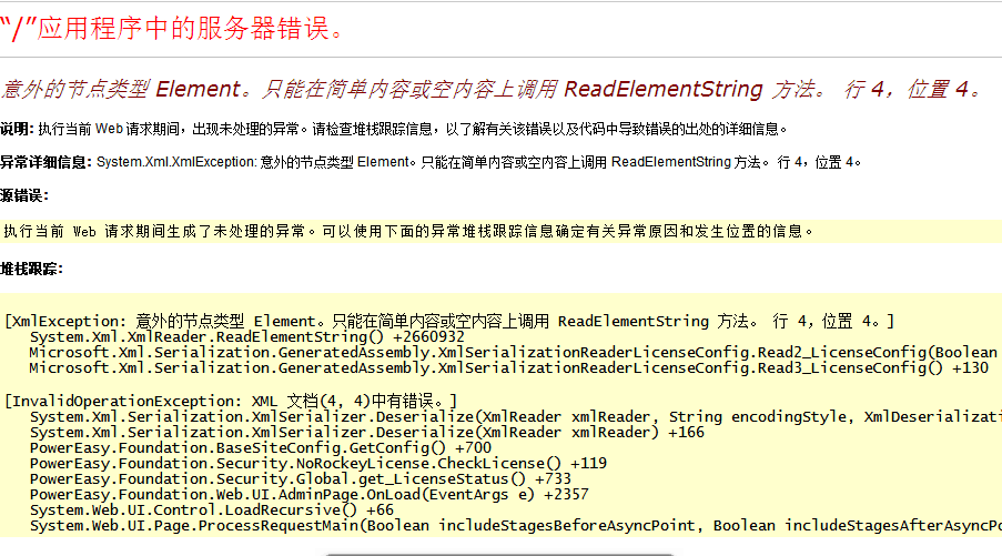 “/”应用程序中的服务器错误 来源:本站原创 点击数: 次 发布时间:2015年10月06日 问题描述:前台正常,浏览后台报错如下 解决方案:替换config文件夹中的LicenseConfig.config,并重新写入序列号。