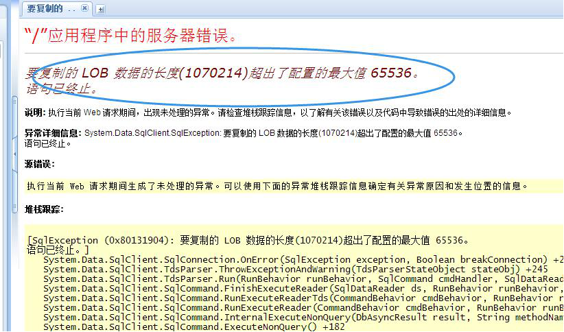 复制的lob数据的长度(77639)超出了配置的最大值65536怎么解决