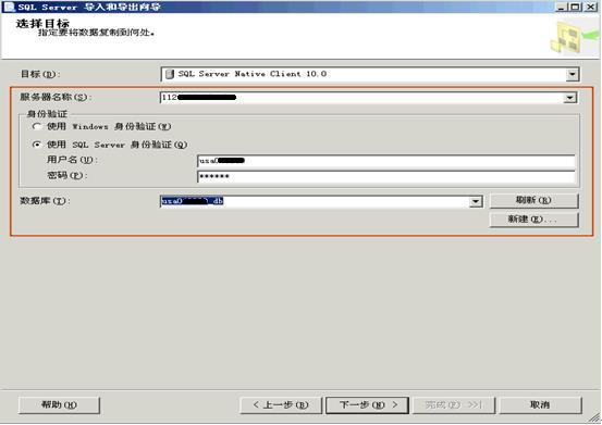 3、选择目标数据库,如下添加万网提供给您的数据库信息(服务器地址,用户名,密码,数据库):