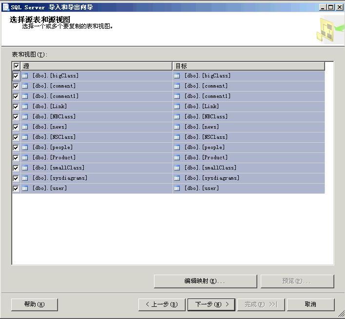 5、点击下一步,选中所有表,并确保“目标”中是 DBO 的所有者: