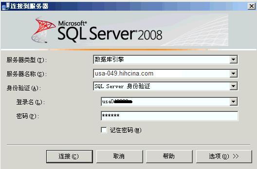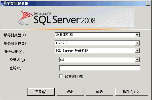 2、登陆本机数据库控制端,身份验证方式使用“SQL Server身份验证”,服务器地址为您本地的数据库地址,登录名和密码为您本地数据库的账号和密码:
