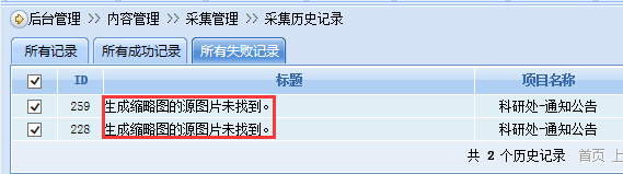 【问题描述】:采集记录里有“生成缩略图的原图片未找到”而导致文章采集失败的记录,如下图: