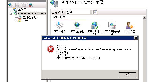 问题描述:IIS无法启动,提示错误:配置文件的XML格式不正确
