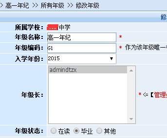 <p style="text-indent: 2em"><strong>问题描述</strong>:学校版系统中如何把学生设置为毕业状态</p> <p style="text-indent: 2em"><strong>问题分析</strong>:不能单独对学生设置毕业,只能对学生所在年级设置为毕业状态</p> <p style="text-indent: 2em"><strong>问题解决</strong>:修改年级状态解决,如下图</p> <p align="center"><img alt="" border="0" src="$/History/tech/uploadfiles/help/2016/7/201607281614557394.png" /></p>