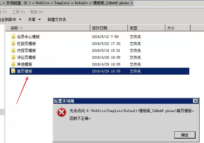 网站后台打开手机模板页面报黄页错误:函数不正确