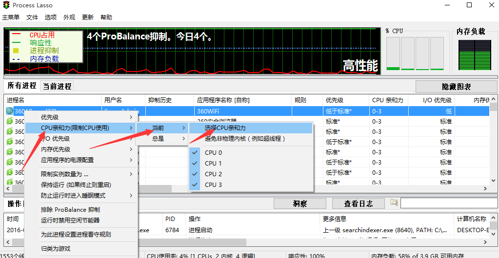 一般我们这样设置后会发现占用量确实降低了,服务器也不卡了,但是,重启下会复原,所以我们要用到工具process lasso,这个工具可以一直控制后台服务项目采用几颗CPU进行工作比较好用